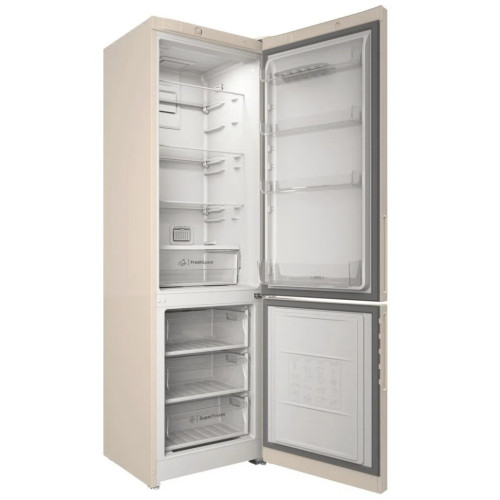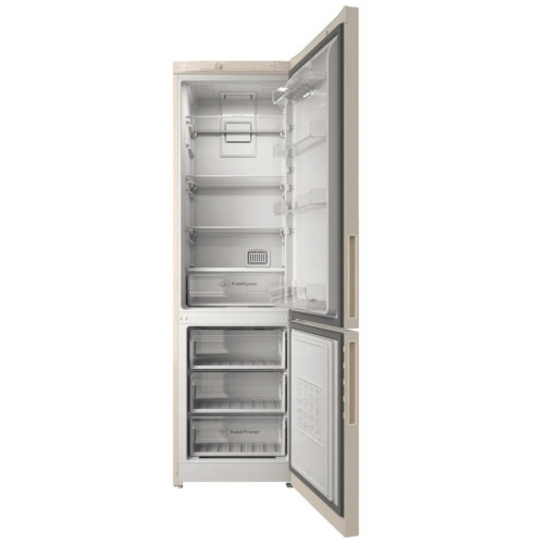 Холодильник полноразмерный с морозильником Indesit ITR 4200 бежевого цвета имеет лаконичный дизайн, подходящий практически под любой интерьер кухни. А благодаря хорошей вместительности обеих камер холодильника хранить в нем продукты очень удобно. Морозильная камера объемом 78 л располагается внизу, а значит, класть и вынимать из нее продукты будет очень легко и удобно. Температура замораживания в морозилке составляет -18°С. Если внезапно отключается электричество, то в морозильной камере сохраняется оптимальная температура (до -9°С) на протяжении 14 ч. Чтобы регулировать температуру охлаждения в верхнем отделении, холодильник Indesit ITR 4200 E оснащен поворотным переключателем. В холодильной камере имеются регулируемые по высоте полки, сделанные из закаленного стекла и способные выдерживать высокую нагрузку (до 100 кг). Также есть полки в дверце холодильника и выдвижной контейнер под фрукты/овощи. Для более комфортной эксплуатации прибора предусмотрено LED-освещение холодильной камеры. Технология No Frost предупреждает появление льда на стенках камер холодильника, поэтому он не требует разморозки.