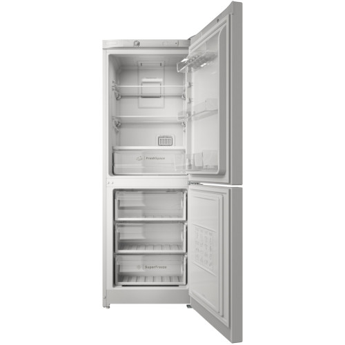 Двухкамерный холодильник Indesit ITS 4160 S можно вписать практически в любой современный кухонный интерьер. Благодаря сравнительно небольшой ширине устройство подходит даже для малогабаритных помещений. Общий объем составляет 285 л. Уровень шума работающего устройства не превышает 43 дБ. Использование системы No Frost позволяет избежать образования льда как в холодильной, так и в морозильной камере. Благодаря ей вы можете не беспокоиться о ручной разморозке. Объем холодильной камеры и морозильника Indesit ITS 4160 S составляет 179 и 78 л соответственно. В первой предусмотрено 3 полки, на которых можно разместить продукты и емкости разного объема и габаритов. Каждая полка выполнена из сверхпрочного стекла, выдерживающего большую нагрузку без риска деформации. Также в холодильной камере имеются 3 полки-балкона, расположенные на двери — там вы можете разместить яйца, бутылки с молоком, пучки зелени и многое другое. Морозильная камера, которая находится снизу, рассчитана на мощность замораживания 4 кг/сутки.