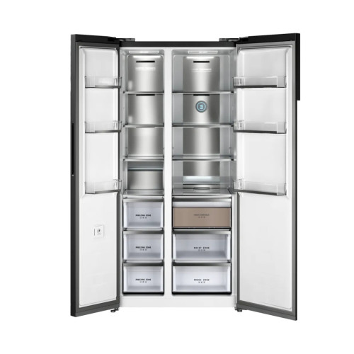 Холодильник Kuppersberg RFSN 1990 SG Коллекция High-Tech Отдельностоящий холодильник Side by Side Количество дверей 2 Инверторный компрессор да Климатический класс SN/N/ST/T Общий объем, л 503 Уровень шума, дБ 36 Высота, см 191.2 Ширина, см 91.1 Глубина, см 60 Морозильное отделение Выдвижные ящики 3 Полки для заморозки 4 Мощность замораживания 10кг/24ч Количество дверных полок 3 Количество регулируемых полок м/к 3 Количество полок м/к 4 Безопасность Блокировка от детей да Управление Электронное управление да Комплектация Длина сетевого шнура 240 см Холодильное отделение Полезный объем, л 294 Количество стеклянных полок 4 Навесные дверные полки 3 Отсек для овощей 3 Зона свежести да Энергоэффективность Класс энергопотребления A++ Преимущества LED дисплей да Перенавешиваемые двери нет Полки регулируемые по высоте 3 Размораживание морозильной камеры No Frost Размораживание No Frost Система No Frost да, полный Светодиодное освещение камеры да Супер заморозка да Супер охлаждение да Хранение при отключении питания, ч 10