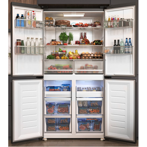 Холодильник LEX LCD505BgID станет отличным выбором для большой семьи и стильной кухни. Объем 505 литров позволит разместить все, чего вам захочется. Полезный объем холодильной камеры - 321 л Полезный объем морозильной камеры - 144 л Охлаждение и заморозка происходят по системе No Frost, без образования инея, поэтому вам не нужно тратить время на размораживание. Современный инверторный компрессор работает эффективнее, тише и быстрее обычного, а технология LEX Volume Stream Air обеспечивает более равномерное охлаждение. Задняя стенка холодильной камеры покрыта металлом с высокой теплопроводностью, благодаря чему система охлаждения быстрее выравнивает колебания температуры. Модель типа CROSS DOOR имеет верхнее холодильное и два независимых нижних морозильных отделения. Такая конструкция помогает поддерживать подходящие условия хранения внутри каждой камеры, даже если вы часто открываете дверцы. Диапазон температур: +8…–23 °C, но с функцией суперзаморозки можно быстро снизить температуру в морозильном отделении до –28 °С. Похожий режим есть и в холодильной камере. Холодильник оснащен функцией сохранения температуры в течение 12 часов, которая выручит при отключении электричества. Благодаря понятной электронной панели управления и яркой подсветке вы всегда сможете точно контролировать условия хранения. А когда такой возможности нет, будет достаточно одного нажатия, чтобы автоматически установить в каждом отделении температуры, которые позволяют экономить энергию, но не влияют на качество хранения продуктов.