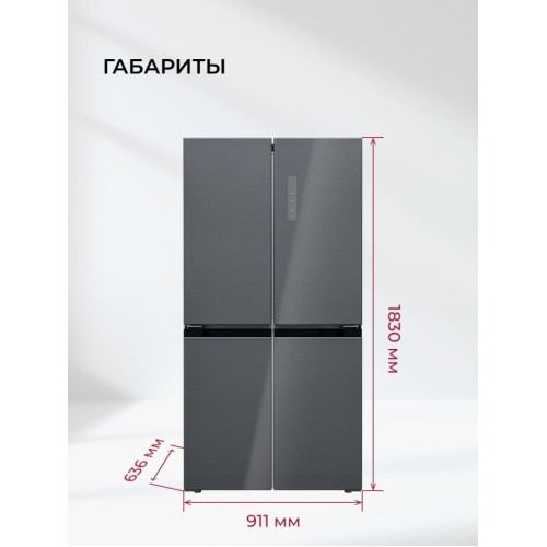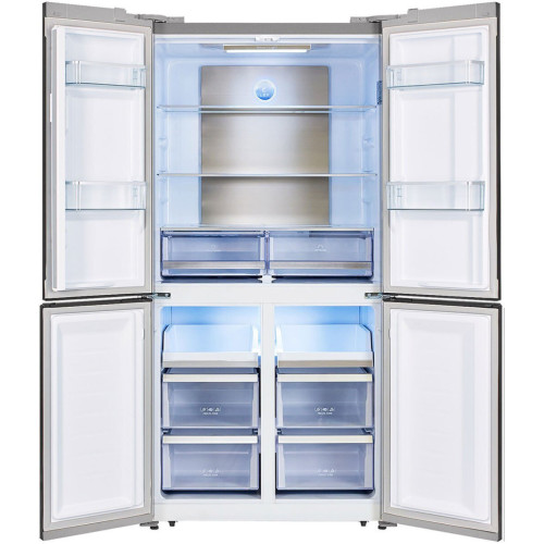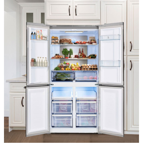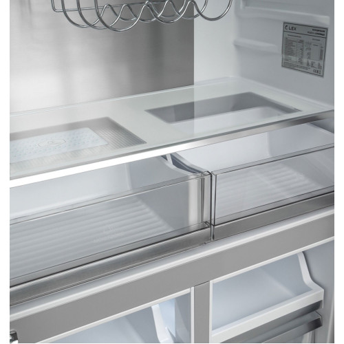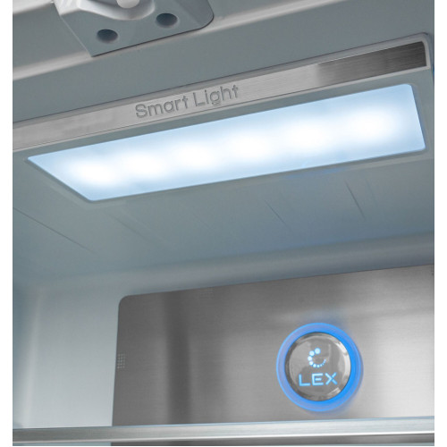 Холодильник LEX LCD 505 станет отличным выбором для большой семьи и стильной кухни. Объем 505 литров позволит разместить все, чего вам захочется. Охлаждение и заморозка происходят по системе No Frost, без образования инея, поэтому вам не нужно тратить время на размораживание. Современный инверторный компрессор работает эффективнее, тише и быстрее обычного, а технология LEX Volume Stream Air обеспечивает более равномерное охлаждение. Задняя стенка холодильной камеры покрыта металлом с высокой теплопроводностью, благодаря чему система охлаждения быстрее выравнивает колебания температуры. Модель типа CROSS DOOR имеет верхнее холодильное и два независимых нижних морозильных отделения. Такая конструкция помогает поддерживать подходящие условия хранения внутри каждой камеры, даже если вы часто открываете дверцы. Диапазон температур: +8…–23 °C, но с функцией суперзаморозки можно быстро снизить температуру в морозильном отделении до –28 °С. Похожий режим есть и в холодильной камере. Холодильник оснащен функцией сохранения температуры в течение 12 часов, которая выручит при отключении электричества. Благодаря понятной электронной панели управления и яркой подсветке вы всегда сможете точно контролировать условия хранения. А когда такой возможности нет, будет достаточно одного нажатия, чтобы автоматически установить в каждом отделении температуры, которые позволяют экономить энергию, но не влияют на качество хранения продуктов. Объем холодильной камеры 321 л Объем морозильной камеры 144 л Цвет, заявленный производителем, - сапфир / стекло