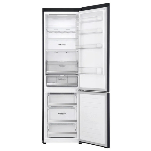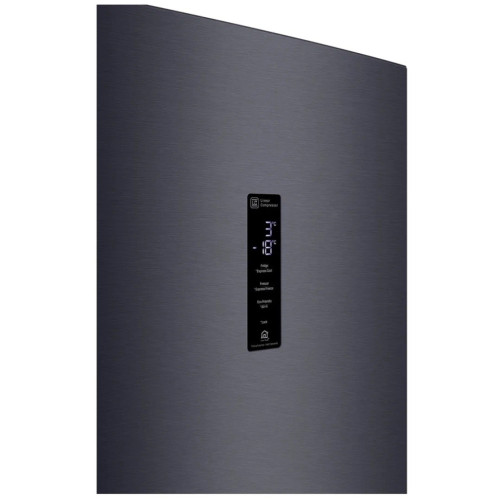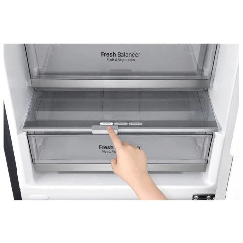 Особенность модели – технология DоorCоoling+, которая обеспечивает дополнительное охлаждение из панели в верхней части холодильника, охлаждая продукты равномерно и на 32% сильнее, чем холодильники без данной технологии. Теперь даже на полках двери поддерживается постоянная температура, аналогичная той, что и на полках внутри холодильника. В холодильнике предусмотрена полка для хранения бутылок. Точный контроль температуры и минимизация температурных колебаний возможен благодаря линейному инверторному компрессору и технологии Linear Cooling, которые помогают надолго сохранить свежесть и привлекательный внешний вид овощей и фруктов. Для овощей и фруктов предусмотрена отдельная зона FreshBalancer. Оптимальная влажность поддерживается в ней при помощи простого регулятора. В зоне FreshConverter вы можете выбрать подходящий вариант: -2? – для мяса, 0? – для рыбы, 3? – для овощей. В основном отделении есть усовершенствованная складная полка. Благодаря двум вариантам складывания она позволяет хранить крупные и габаритные продукты или блюда. Установите на смартфон фирменное приложение LG ThinQ. Оно позволяет удалённо регулировать настройки и включать дополнительные функции, а также получать уведомления на мобильный девайс, если вы забыли закрыть дверь холодильника.