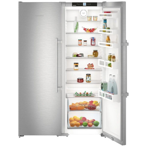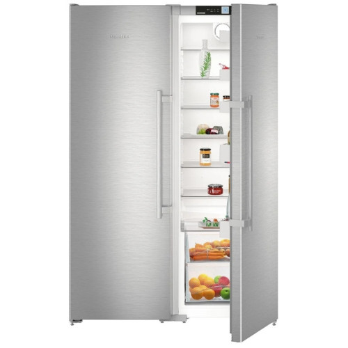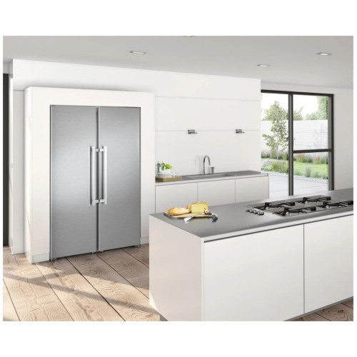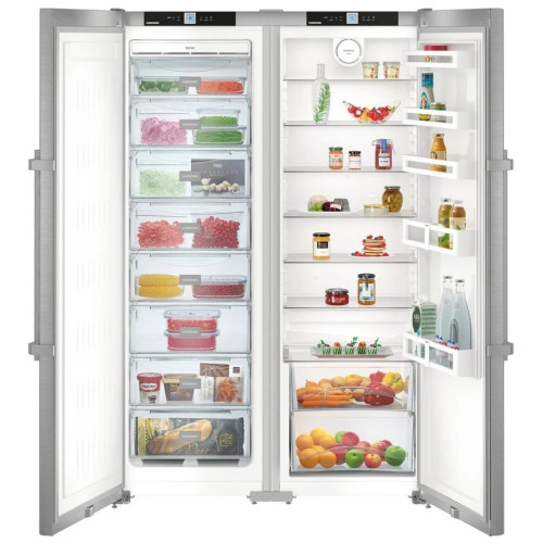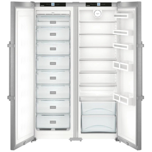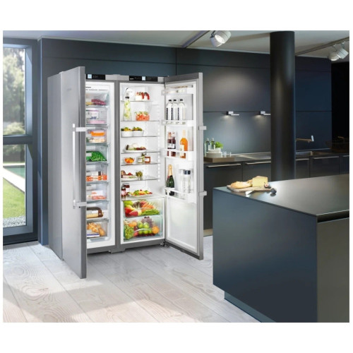 Холодильник с распашными дверями (Side by Side) Liebherr SBSef 7242 – классическая модель типа Side-by-Side. Фактически устройство представляет собой комбинацию из морозильника и собственно холодильника, которые независимы друг от друга. Процесс сборки не вызывает сложностей. Беспроблемна и транспортировка. Преимуществом такого типа конструкции является возможность полного отключения одной из камер. Это может быть, например, актуально при поездке в отпуск. Каждый из компонентов системы обладает собственной панелью управления с дисплеем и, естественно, собственным компрессором. Показания температуры на дисплеях отлично различимы с большого расстояния. Холодильник характеризуется общим полезным объемом 696 л. Величина данного показателя примерно вдвое превышает полезный объем классического полноразмерного холодильника. Модель оптимальна для эксплуатации на кухне, «обслуживающей» многочисленную семью. Объем холодильной камеры равен 393 л, а морозильной – 303 л. В числе функций холодильника – защита от детей, режим суперохлаждения и режим суперзаморозки. В наличии система NoFrost.Холодильник соответствует классу энергоэффективности A++. Климатические классы модели – SN и T. Холодильник может эксплуатироваться как при низкой, так и при очень высокой температуре воздуха. Цвет корпуса – серебристый. Это цветовое решение может гармонировать с кухней любого стиля.