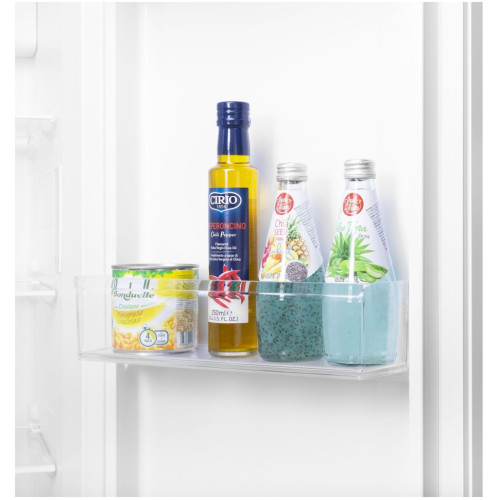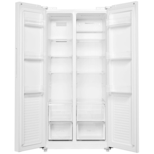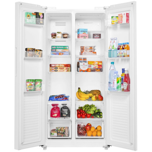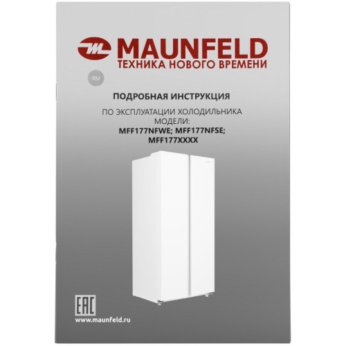 Maunfeld MFF177NFWE – стильный холодильник формата side-by-side с камерами вместительностью 433 л. В нём достаточно пространства для раздельного и гигиеничного хранения очень большого количества разнообразных продуктов питания. Модель оснащена простой и удобной панелью управления, которая позволяет парой нажатий на кнопки установить подходящий температурный уровень. Причём сделаете вы это обособленно для каждого из отсеков, то есть зададите максимально гибкие настройки. В «сердце» устройства – инверторный компрессор, расходующий незначительный объём электроэнергии. Второе из двух главных его преимуществ – это тихая работа без какого-либо отвлекающего и раздражающего шума. Благодаря технологии Total No Frost вам не придётся заниматься ручной разморозкой. Ведь наледь и иней просто-напросто не будут появляться на стенках отделений. Если вы оставите дверь открытой более, чем на три минуты, то, чтобы вы не забыли её захлопнуть, активируется звуковая сигнализация. А функция самодиагностики известит вас о возможной неисправности сразу же после её возникновения.