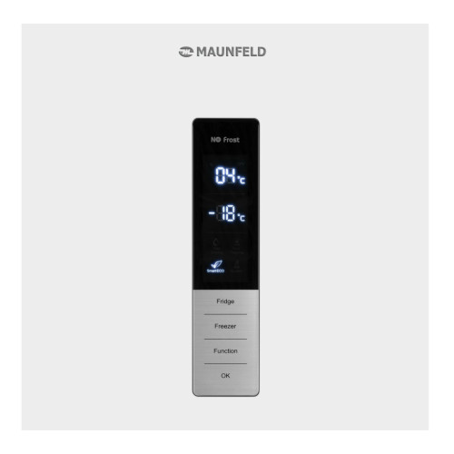 Двухкамерный холодильник c системой полный NoFrost в холодильном и морозильном отделениях АНТИБАКТЕРИАЛЬНАЯ СИСТЕМА Внутренние стенки и внутренняя поверхность дверцы холодильников MAUNFELD подвергаются специальной антибактериальной обработке, благодаря чему обеспечивается постоянная санитарная безопасность. СИСТЕМА NOFROST Больше нет необходимости размораживать холодильник, так как наледь не образуется в холодильниках MAUNFELD с системой автоматического оттаивания (NoFrost). Главные преимущества системы NoFrost в морозильной камере: замороженные продукты больше не склеиваются, не уменьшается внутреннее пространство из-за образования наледи, а ящики всегда так же легко и удобно открывать, как при первом использовании камеры. Более того, отсутствие наледи на стенках обеспечивает эффективный процесс теплообмена, что поддерживает энерго-потребление на низком уровне. высокий уровень мощности охлаждения, поддерживаемый системой NoFrost, позволяет замораживать значительное количество продуктов при поддержании постоянной температуры, сохраняя все пищевые свойства. ДИНАМИЧЕСКОЕ ОХЛАЖДЕНИЕ Специальный вентилятор в моделях MAUNFELD равномерно распределяет холодный воздух в холодильнике. Поэтому, продукты на любой полке и в любом положении будут храниться в оптимальных условиях. ФУНКЦИОНАЛЬНОЕ ВНУТРЕННЕЕ ПРОСТРАНСТВО Холодильная техника MAUNFELD разработана специально с учетом возможности оптимизации пространства внутри каждого прибора: высота стойки для бутылок, отделений и полок регулируется по желанию каждого пользователя для наиболее эффективного использования внутреннего пространства. Различные виды полок из закаленного стекла, и решеток можно использовать для моделирования внутреннего пространства холодильника по желанию пользователя. Внутренние стенки легко чистить благодаря идеально гладкой структуре и покрытию.