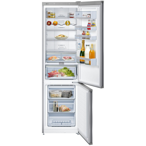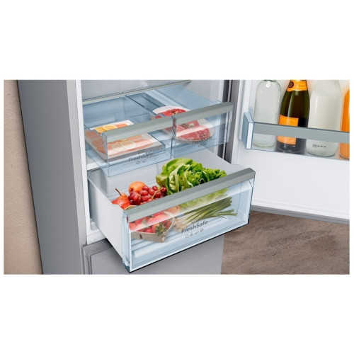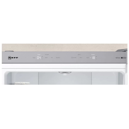 Долговечное светодиодное освещение распространяет яркий свет сверху вниз. Преимущество не только в том, что вы действительно хорошо видите свои продукты, но и в экономии энергии, поскольку светодиодное освещение не нагревается Функция NoFrost оставляет в прошлом влажные полотенца и размороженную пищу. Морозильная камера сама занимается разморозкой, регулярно удаляя скопившийся иней. Регулируемые полки из стекла safety glass позволяют удобно хранить большие предметы и большие порции. Суперохлаждение ненадолго снижает температуру до +2 °C. Будьте уверены в быстром охлаждении больших дополнительных порций без разогрева других продуктов в холодильнике. Суперохлаждение автоматически возвращается к обычным настройкам.