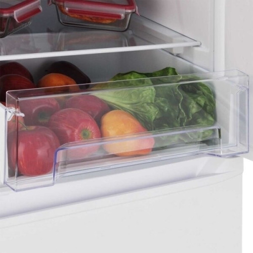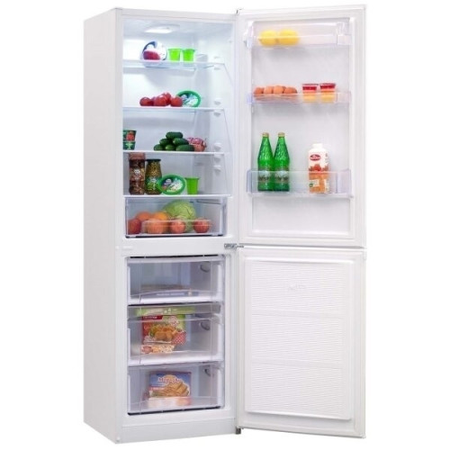 Nordfrost CX 352 032 – простой в использовании холодильник, в котором достаточно пространства для хранения различных съестных припасов. На основное отделение приходится 205 л, а на морозильник – 115 л. главная детальмодель оснащена стандартным компрессором, работающим предельно тихо: уровень создаваемого шума составляет всего 40 дБ. Это сравнимо с приглушённой беседой, поэтому не доставит дискомфорта. Кроме того, прибор может похвастаться экономичным расходом электричества, поскольку относится к разряду A+ по степени энергоэффективности. Если вдруг ваш дом будет обесточен, то еда не испортится, потому температура внутри устройства не повысится ещё в течение целых 10 часов. Внутренняя составляющаяв холодильном отсеке установлено четыре полки из прочного закалённого стекла – один ярус регулируется по высоте. В ящике зоны свежести поддерживается оптимальный микроклимат для того, чтобы фрукты, овощи и зелень не теряли влагу и долго не вяли. Дверные балкончики предназначены для небольших упаковок и бутылок с напитками и соусами. Для длительного хранения полуфабрикатов и зимних заготовок в морозильной камере предусмотрены выдвижные контейнеры. Встроенное LED-освещение обеспечивает отличный обзор всех продуктов.