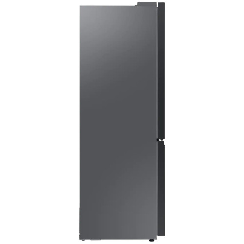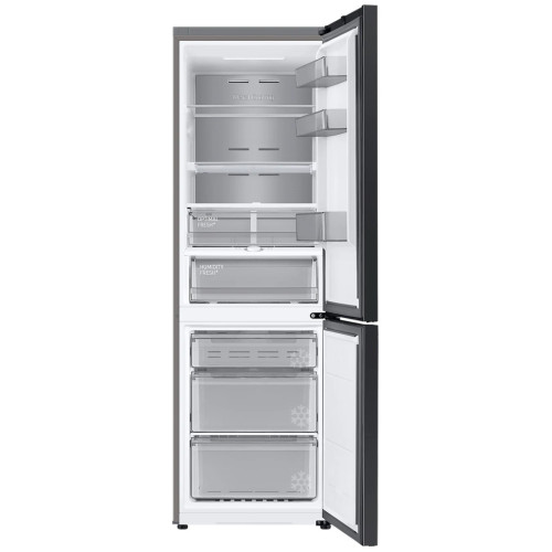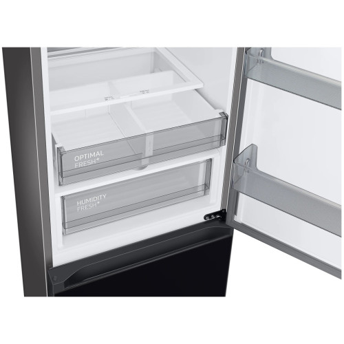 Холодильник Samsung rb34a7b4f39 входит в коллекцию Bespoke. Вы можете устанавливать его рядом с другими модулями, а также менять декоративные панели, отличающиеся цветами, материалами и фактурой. Это позволяет гармонично вписывать его в дизайнерский интерьер кухни или квартиры-студии. Холодильник построен по технологии SpaceMax. Качественная теплоизоляция даёт возможность уменьшить толщину стенок по сравнению с другими моделями. Благодаря этому вам доступно больше полезного объёма при тех же наружных размерах. Задняя панель холодильника покрыта тяжёлой металлической плитой. В ней есть вентиляционные отверстия для подачи воздуха. Такая конструкция помогает поддерживать одинаковую температуру на всех уровнях и долго сохранять холод после отключения питания. В зоне свежести есть два отделения. Вы можете снизить температуру в одном из этих лотков, чтобы создать оптимальные условия для хранения мяса и рыбы. Функция управления влажности помогает сохранить свежесть продуктов и защитить их от плесени. Плоская задняя часть позволяет ставить холодильник вплотную к стене. В увеличенные дверные ящики помещаются бутылки объёмом до 2,5 л каждая.
