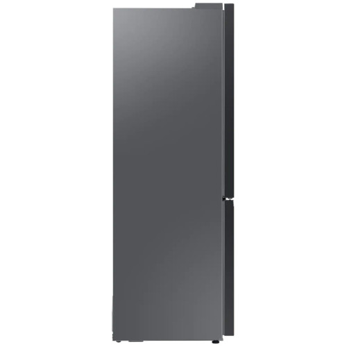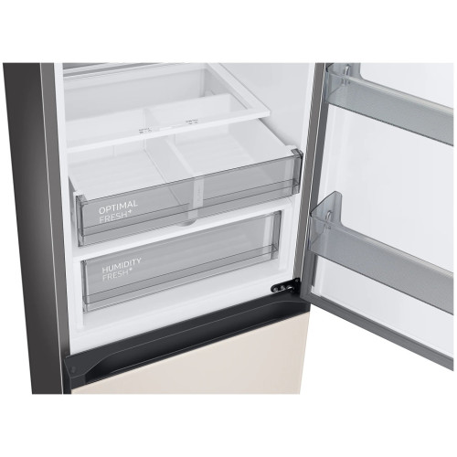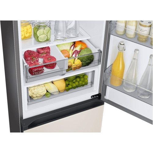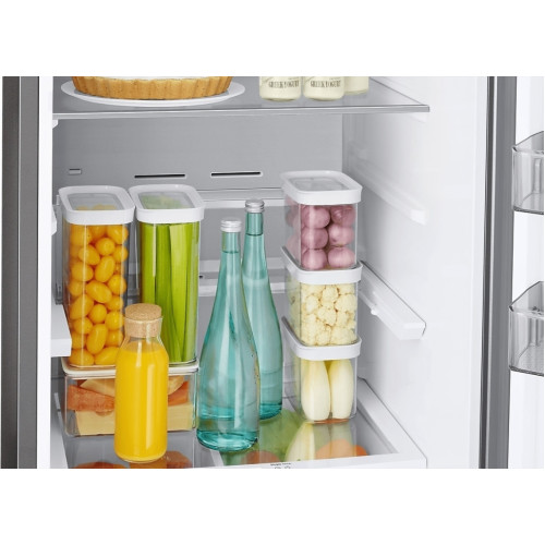 Холодильник Samsung rb34a7b4f39 входит в коллекцию Bespoke. Вы можете устанавливать его рядом с другими модулями, а также менять декоративные панели, отличающиеся цветами, материалами и фактурой. Это позволяет гармонично вписывать его в дизайнерский интерьер кухни или квартиры-студии. Холодильник построен по технологии SpaceMax. Качественная теплоизоляция даёт возможность уменьшить толщину стенок по сравнению с другими моделями. Благодаря этому вам доступно больше полезного объёма при тех же наружных размерах. Задняя панель холодильника покрыта тяжёлой металлической плитой. В ней есть вентиляционные отверстия для подачи воздуха. Такая конструкция помогает поддерживать одинаковую температуру на всех уровнях и долго сохранять холод после отключения питания. В зоне свежести есть два отделения. Вы можете снизить температуру в одном из этих лотков, чтобы создать оптимальные условия для хранения мяса и рыбы. Функция управления влажности помогает сохранить свежесть продуктов и защитить их от плесени. Плоская задняя часть позволяет ставить холодильник вплотную к стене. В увеличенные дверные ящики помещаются бутылки объёмом до 2,5 л каждая.