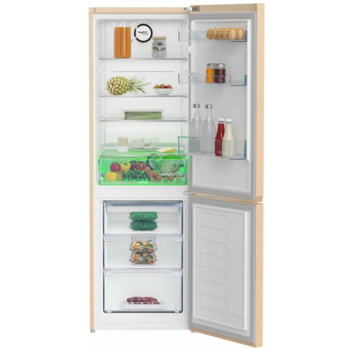 Beko HarvestFresh B1DRCNK362HSB - двухкамерный холодильник с нижней морозильной камерой и общим объемом 368 л оснащен двухконтурной системой охлаждения NoFrost Dual Cooling (Ноу Фрост), которая разделяет воздушные потоки в холодильной и морозильной камерах и не допускает смешивания запахов и образования льда на стенках. Холодильник не нужно размораживать, а специальный режим «Отпуск» снижает потребление электроэнергии, если вы не пользуетесь им долгое время. Ящик для фруктов и овощей в холодильнике Beko дополнен технологией 3-х цветов HarvestFresh, благодаря которой продукты дольше сохраняют свежесть, натуральный вкус и витамины. "Умное" распределение электроэнергии. На время вашего отсутствия вы можете перевести холодильник в режим "Отпуск" и отключить холодильное отделение. Это позволит сэкономить на счете за электричество и в тоже время не беспокоиться за сохранность продуктов в морозильной камере. Забота о семейном бюджете и окружающей среде. Позаботиться о счетах за электроэнергию и состоянии окружающей среды позволит класс энергоэффективности холодильника А+. Модели А+ энергоэффективны более, чем на 20%, по сравнению с моделями класса А. Технология FreezerGuard от Beko обеспечивает исправную работу морозильной камеры даже при низких температурах окружающей среды– морозилка может работать с неизменной производительностью в неотапливаемом помещении при температуре до -15 °С.
