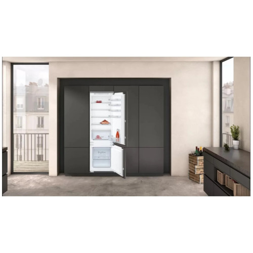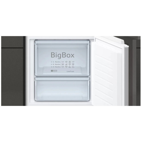 Холодильно-морозильная комбинация с зоной свежести позволяет дольше сохранять свежесть продуктов. Специальный прозрачный ящик Fresh Safe, расположенный в самой холодной части холодильника, защищает фрукты и овощи. Регулируемые по высоте полки из безопасного стекла обеспечат необходимое пространство для объёмных продуктов или больших порций. Долговечное светодиодное освещение подаёт яркий свет сверху вниз. Преимущество не только в том, что вы действительно хорошо видите продукты, но и в экономии энергии, поскольку светодиод не нагревается. Морозильник — ваш универсальный компаньон, когда дело доходит до максимального использования пространства. Храните громоздкие продукты в Big Box — очень большом ящике, который вместит всё необходимое. А Vario Zone позволит снимать даже стеклянные полки, создавая максимум пространства. Если нужно заморозить объёмный продукт, вы можете понизить температуру в морозильной камере, чтобы уже замороженные продукты не нагрелись, находясь в том же ящике. Режим «Супер замораживание» временно снижает температуру перед автоматическим переключением обратно. Избавляясь от льда с Low Frost, вы потратите намного меньше времени на разморозку морозильной камеры, чем раньше. Кроме того, LowFrost защищает продукты от заморозки, потребляет меньше энергии и работает почти бесшумно.