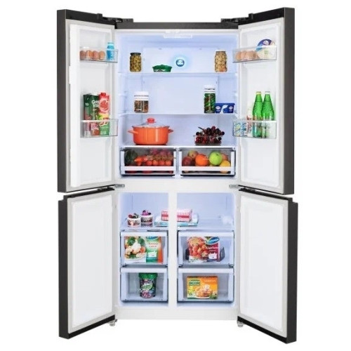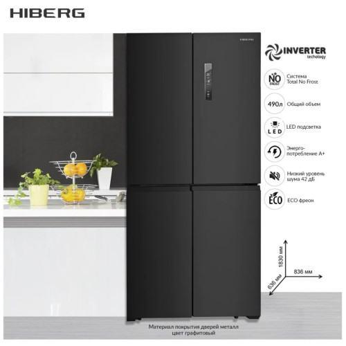 Отдельностоящий, стильный и вместительный холодильник HIBERG RFQ 490DX NFB INVERTER предназначен для хранения большого количества продуктов и напитков в частных и загородных домах, крупногабаритных квартирах и офисах. 4-х дверный холодильник имеет общий объем 490 л, единое пространство верхних полок холодильной камеры, чтобы удобно было размещать габаритные кастрюли и контейнеры. Прочные полки из закаленного стекла можно регулировать по высоте, а ящики в холодильной камере предназначены для хранения овощей и фруктов. Устройство имеет систему охлаждения Total No Frost, с которой Вам не придется больше размораживать холодильник, достаточно обычного ухода раз в 6 месяцев. Холодильник HIBERG RFQ 490DX NFB обладает высоким классом энергоэффективности А+. Инверторный компрессор обеспечивает практически бесшумную работу с минимальным энергопотреблением. Модель имеет LED – освещение в обеих камерах, а так же электронное управление с встроенным дисплеем, на котором отображается температура и режимы работы. Режимы «Суперзаморозка» и «Суперохлаждение» обеспечивают быстрое охлаждение продуктов в морозильной или холодильной камере и далее поддерживают оптимальную температуру для хранения. Многопоточная система охлаждения поддерживает оптимальную температуру на каждой полке, поэтому продукты дольше остаются свежими. Мембранная технология улучшает условия хранения овощей и фруктов, поддерживая уровень влажности в ящиках до 90%. Режим «Отпуск» позволит сэкономить электроэнергию за счет редкого включения инверторного компрессора в период долгого отсутствия членов семьи. Модель RFQ 490DX NFB имеет функцию «Блокировка от детей», а так же предупреждающий звуковой сигнал, если дверь открыта больше двух минут. Двери металлические в цвете графит. Особенности и преимущества: - 4 двери; - инверторный компрессор; - Total No Frost; - цвет фасада: «графитовый»; - материал покрытия дверей: металл. Холодильник HIBERG RFQ 490DX NFB INVERTER – это высококлассное устройство, которое сочетает в себе техническое совершенство, удобство хранения и современный дизайн!