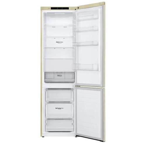 Холодильник с морозильником LG GC-B509SECL ‒ тихий и надежный прибор с инверторным компрессором, многопоточной системой охлаждения. Для равномерного и быстрого распределения воздуха по камере в верхней части камеры находится панель холодного воздуха. В результате продукты надолго сохраняют свежесть. Благодаря интеллектуальной системе диагностики все неисправности отображаются на дисплее. Технология No Frost не требует размораживания камер, защищая стенки от накопления наледи. LG GC-B509SECL выполнен в бежевом корпусе размерами 59.5x203x68.2 см. Металлическое внешнее покрытие защищает поверхность от механических воздействий. Общий объем 384 л распределен между камерами: верхняя занимает 277 л, а нижняя ‒ 107 л. В пространстве холодильной камеры предусмотрена нулевая зона, в которой продукты дольше сохраняют свежесть и пользу. Сенсорная панель с дисплеем скрыта за дверцей. Она позволяет удобно настраивать температурный режим и активировать дополнительные функции.