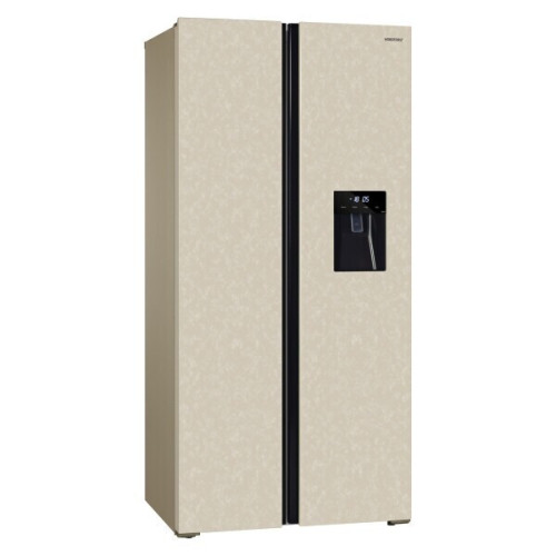 Отдельностоящий инверторный холодильник NORDFROST RFS 484D NFYm типа Side-by-Side с общим объемом 472 литра идеально пойдет для большой семьи и крупногабаритных кухонь. Модель характеризуется высоким классом энергоэффективности А++, низким уровнем шума и долгим сроком эксплуатации, благодаря инверторному компрессору. А с системой Total No Frost на стенках не образовывается наледь и иней, что навсегда избавит пользователя от ручного размораживания. Особенность модели – наличие диспенсера для воды на фасаде двери объемом 2 литра. Такая конструкция позволяет наливать охлажденную воду, не открывая холодильник. Встроенный ледогенератор внутри морозильной камеры позволит освежиться напитками с кубиками льда. Холодильник оснащен двумя вместительными камерами: холодильная объемом 267 л и морозильная объемом 165 л. Внутреннее пространство холодильника: - 5 полок из закаленного стекла в холодильном отделении; - 2 полки на дверце холодильной камеры; - 1 выдвижной ящик; - подставка для яиц; - 5 полок из закаленного стекла в морозильном отделении; - 1 выдвижной ящик в морозильном отделении; - 2 полки на двери морозильной камеры; - диспенсер для воды; - встроенный поворотный ледогенератор. Холодильник с LED – освещением в обеих камерах, сенсорным управлением и дисплеем, с помощью которого можно выставить точную температуру и режим работы. Режимы «Суперзаморозка» и «Суперохлаждение» обеспечивают быстрое охлаждение продуктов в морозильной или холодильной камере и далее поддерживают оптимальную температуру для хранения. Режим «Отпуск» позволит сэкономить электроэнергию за счет редкого включения инверторного компрессора в период долгого отсутствия членов семьи. Холодильник имеет функцию «Блокировка от детей», а также предупреждающий звуковой сигнал, если дверь открыта больше двух минут. Холодильник выполнен в стильном и лаконичном дизайне в цвете «бежевый мрамор». Особенности и преимущества: - тип Side-by-Side; - класс энергоэффективности А++; - объем 472 л; - Total No Frost; - инверторный компрессор; - встроенный диспенсер для воды; - механический поворотный ледогенератор; - электронное управление; - материал покрытия дверей: металл.