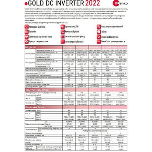 Минимальный уровень шума внутреннего блока (дБ) : 21 Максимальный уровень шума внутреннего блока (дБ) : 30 Площадь помещения до 27 м Инверторный, гарантия - 3 года, компрессор GMCC-Toshiba Сплит-системы Denko серии Gold объединяют в себе лучшие качества современной техники: доступность, технологичность, производительность и простоту управления. В данных инверторных кондиционерах воплощены новейшие достижения, в сфере очистки и распределения потоков воздуха, которые создадут благоприятные условия в вашем доме. Данная серия обеспечит комфортное, равномерное охлаждение в жару и нагрев в межсезонье, благодаря инверторным технологиям и современным функциям. Антибактериальный фильтр поможет в поддержании здоровой атмосферы в помещении.