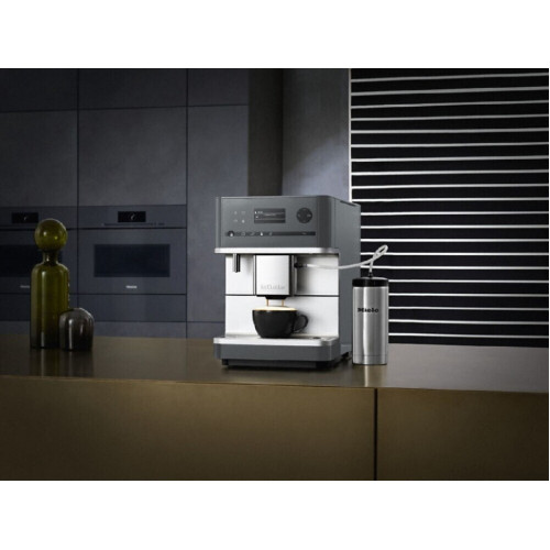 Кофемашина Miele CM6350 представляет собой функциональный аппарат, который оснащен дисплеем и панелью с кнопками для удобного управления и эксплуатации. Прибор мощностью 1500 Вт готовит кофе с восхитительным ароматом благодаря использованию динамичной камеры заваривания, которая при наполнении теплой водой расширяется. Это способствует более интенсивному смешению воды и кофе, в результате чего напиток получается очень насыщенным. Для безопасной эксплуатации устройство поддерживает блокировку включения при нажатии на соответствующйю кнопку. Эта опция особенно актуальна, когда получить доступ к панели с кнопками могут дети. Miele CM6350 использует для приготовления эспрессо как молотый, так и зерновой кофе благодаря встроенной кофемолке. В емкость для зерен помещается 300 грамм продукта. Аппарат поддерживает сохранение индивидуальных настроек: количество кофе, степень помола, количество воды, температура заваривания и других параметров. Вы сможете также сохранить индивидуальный рецепт приготовления в памяти.