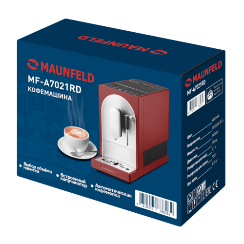 Персональный бариста - всегда под рукой. По-настоящему компактная кофемашина с широким набором возможностей. Приготовление напитков одним касанием с настройкой рецептов по своему вкусу. Управление одним касанием Сенсорная панель с удобной и наглядной индикацией. Все нужные настройки - легким нажатием. Наслаждайтесь не только результатом, но и процессом. Кофемолка В кофемашину встроена кофемолка объемом 160 г. Измельчите зерно непосредственно перед приготовлением напитка – вкус и аромат кофе будет более ярким, богатым и насыщенным. При помощи регулятора вы можете самостоятельно установить необходимую степень помола зерна. Для лучшего раскрытия вкуса кофе светлой обжарки выбирайте мелкий помол, крупный помол больше подойдет для зерен темной обжарки. Давление 19 бар Благодаря мощной помпе при заваривании напитка в кофемашине поддерживается постоянное высокое давление 19 бар. Оно позволяет получить вкусный сбалансированный кофе, по качеству не уступающий напитку из профессиональной кофемашины. Выбор объема порции Вы можете выбрать объем порции и сохранить настройки в память кофемашины вместо заводских, чтобы прибор автоматически заваривал для вас идеальную чашку кофе! Дозатор кофе можно регулировать по высоте , благодаря чему MF-A7021 всегда аккуратно нальет напиток как в маленькую чашку для эспрессо, так и в большую чашку для американо. Кофемашина автоматически включает подсветку рабочей зоны, поэтому контролировать приготовление напитка удобно даже в темном помещении. Приготовление капучино Кофемашина оснащена капучинатором, который позволит быстро взбить молоко в густую однородную пену. Используйте его, чтобы приготовить капучино, латте, раф и другие популярные напитки с добавлением молока. Удобная очистка Удобные программы очистки кофемашины позволяют добиться идеальной чистоты. Это позволяет предотвратить появление известкового налёта и загрязнений, что увеличивает срок службы кофемашины и позволяет поддерживать её в отличном состоянии. Очистка контейнера для кофейного жмыха не требует особых усилий – извлечь его из кофемашины можно одним нажатием. Специальный лоток для сбора капель при необходимости можно легко снять и промыть под проточной водой. Магнитная фиксация подставки для чашек.