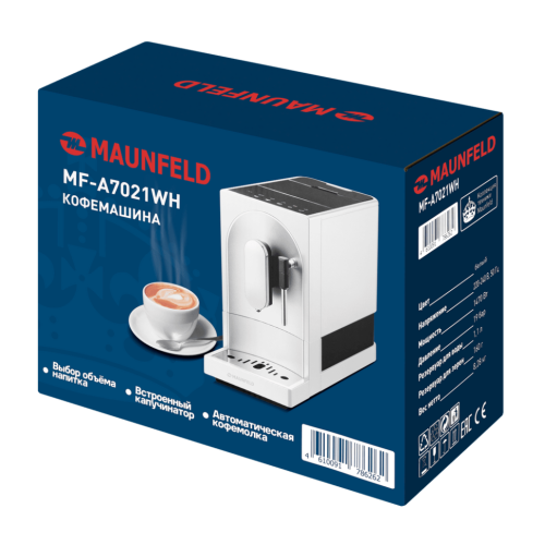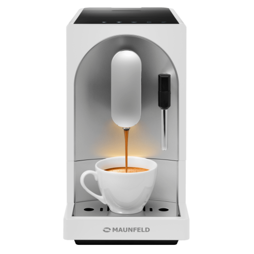 Персональный бариста - всегда под рукой. По-настоящему компактная кофемашина с широким набором возможностей. Приготовление напитков одним касанием с настройкой рецептов по своему вкусу. Управление одним касанием Сенсорная панель с удобной и наглядной индикацией. Все нужные настройки - легким нажатием. Наслаждайтесь не только результатом, но и процессом. Кофемолка В кофемашину встроена кофемолка объемом 160 г. Измельчите зерно непосредственно перед приготовлением напитка – вкус и аромат кофе будет более ярким, богатым и насыщенным. При помощи регулятора вы можете самостоятельно установить необходимую степень помола зерна. Для лучшего раскрытия вкуса кофе светлой обжарки выбирайте мелкий помол, крупный помол больше подойдет для зерен темной обжарки. Давление 19 бар Благодаря мощной помпе при заваривании напитка в кофемашине поддерживается постоянное высокое давление 19 бар. Оно позволяет получить вкусный сбалансированный кофе, по качеству не уступающий напитку из профессиональной кофемашины. Выбор объема порции Вы можете выбрать объем порции и сохранить настройки в память кофемашины вместо заводских, чтобы прибор автоматически заваривал для вас идеальную чашку кофе! Дозатор кофе можно регулировать по высоте , благодаря чему MF-A7021 всегда аккуратно нальет напиток как в маленькую чашку для эспрессо, так и в большую чашку для американо. Кофемашина автоматически включает подсветку рабочей зоны, поэтому контролировать приготовление напитка удобно даже в темном помещении. Приготовление капучино Кофемашина оснащена капучинатором, который позволит быстро взбить молоко в густую однородную пену. Используйте его, чтобы приготовить капучино, латте, раф и другие популярные напитки с добавлением молока. Удобная очистка Удобные программы очистки кофемашины позволяют добиться идеальной чистоты. Это позволяет предотвратить появление известкового налёта и загрязнений, что увеличивает срок службы кофемашины и позволяет поддерживать её в отличном состоянии. Очистка контейнера для кофейного жмыха не требует особых усилий – извлечь его из кофемашины можно одним нажатием. Специальный лоток для сбора капель при необходимости можно легко снять и промыть под проточной водой. Магнитная фиксация подставки для чашек.