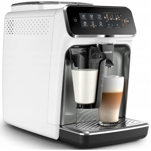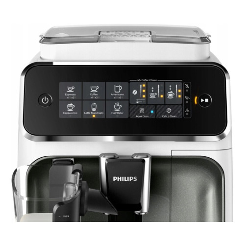 Готовьте любимые напитки — эспрессо, кофе, капучино и латте макиато — одним нажатием кнопки. Каппучинатор LatteGo Series 3200 подарит вам вкусные напитки с нежнейшей молочной пеной. Он устанавливается и очищается всего за 15 секунд. Готовьте любимый кофе для любых случаев: бодрящий эспрессо, классический кофе или капучино — с помощью полностью автоматической эспрессо-кофемашины вы быстро и без лишних усилий сварите идеальный кофе. Легко выбирайте любимый кофе с помощью простой сенсорной панели управления Неповторимый аромат и вкус кофе из свежемолотых зерен за одно касание. Наша простая сенсорная панель управления позволяет без труда выбирать любимый кофе. Настраивайте крепость и объем порции кофе в меню My Coffee Choice. Легко выбирайте нужный параметр из трех доступных опций. Надёжные керамические жернова имеют 12 доступных режимов, чтобы вы могли выбрать нужный помол — от сверхмелкого до крупного. Система Aroma Extract в интеллектуальном режиме находит оптимальный баланс между температурой варки и интенсивностью аромата кофе, поддерживая температуру воды между 90 и 98 °C, а также регулируя количество воды, чтобы вы всегда наслаждались самым вкусным кофе. Система подачи молока состоит из двух элементов и не включает ни одной трубки или скрытых компонентов. Ее можно очистить менее чем за 15 секунд, просто промыв под краном* или в посудомоечной машине. Герметичная конструкция нового типа сохраняет свежесть и аромат кофейных зерен, а также делает работу жерновов менее шумной. Простая очистка деталей в посудомоечной машине Систему подачи молока, поддон для капель и контейнер для кофейной гущи можно мыть в посудомоечной машине. Это удобное решение сэкономит вам время.