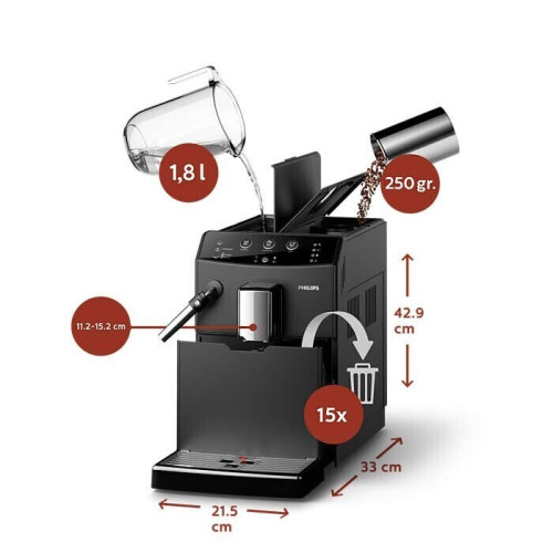 Philips серии 3000 CMF благодаря компактному размеру и высокой вместимости позволяет наслаждаться эспрессо и классическим кофе из свежих зерен — требуется лишь одно нажатие кнопки. Готовьте великолепный капучино за считаные секунды, используя классический капучинатор. 100%-но керамические жернова обеспечивают долговечность и неизменное качество помола Керамический материал устойчив к износу, обеспечивает долгий срок службы и бесшумную работу. Это значит, что качество помола кофе будет оставаться неизменно превосходным при приготовлении более чем 15 000 чашек кофе, в которых сохранится весь аромат кофейных зерен. 100%-но керамические жернова обеспечивают долговечность и неизменное качество помола Керамический материал устойчив к износу, обеспечивает долгий срок службы и бесшумную работу. Это значит, что качество помола кофе будет оставаться неизменно превосходным при приготовлении более чем 15 000 чашек кофе, в которых сохранится весь аромат кофейных зерен. Четыре превосходных напитка на выбор — в вашем распоряжении Готовьте любимые напитки для любых случаев: бодрящий эспрессо, классический кофе или кофейный напиток на основе молока — с помощью автоматической кофемашины вы быстро и без лишних усилий сварите идеальный кофе. Регулируйте носик подачи кофе в соответствии с размером чашки Регулируемый носик наших эспрессо-кофемашин подходит для любых чашек, к тому же он исключает разливание и охлаждение напитка. Подавайте кофе идеальной температуры и поддерживайте чистоту кофемашины. Классический капучинатор для великолепной молочной пенки Классический капучинатор, который бариста называют