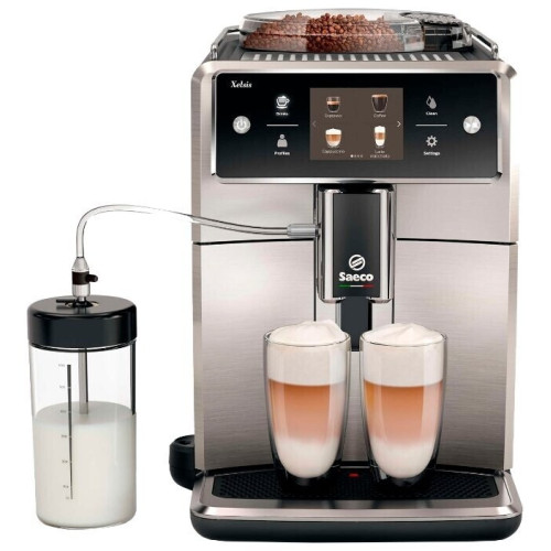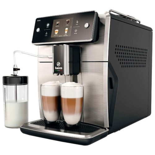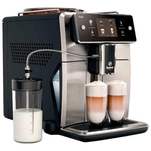 Saeco SM7683/00 – автоматическая кофемашина, умеющая готовить 15 напитков: от эспрессо и ристретто до капучино и американо. Достаточно одного нажатия кнопки, чтобы получить две чашки, а индивидуальные настройки можно сохранить в 8 разных профилях. Эта модель оборудована бойлером с корпусом из алюминия и нержавеющей стали, который быстро нагревается до нужной температуры. Технология Latte Perfetto позволяет создавать такую молочную пену, какую вы предпочитаете – точно так же, как это делает бариста. Встроенная кофемолка превратит зёрна в порошок, который оптимально соответствует вашим вкусовым предпочтениям. Она оборудована устойчивыми к износу керамическими жерновами. Система AquaClea удаляет из воды примеси и в то же время препятствует образованию известкового налёта в контуре подачи. За счёт этого срок эксплуатации устройства увеличивается. Функция HygieSteam очищает горячим паром основные элементы аппарата, от носика до трубок, через которые подаётся молоко. Варочную группу, если потребуется, легко можно снять, промыть под струёй воды и установить на место.