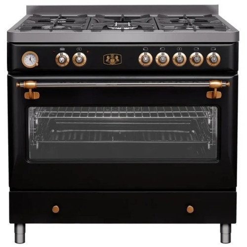 Описание M&G ZBM 3399 ANT — это полноценная отдельностоящая комбинированная плита, варочная поверхность работает от газового типа питания, духовой шкаф электрический. Прибор имеет достаточно внушительные габариты: 96 сантиметров в высоту, 90 в ширину и 70 в глубину. Устройство оснащено пятью конфорками, общая мощность которых составляет 11,1 кВт. Современный классический дизайн, выполненный в темном цвете — антрацит — отлично впишется в любой интерьер и будет сочетаться с имеющимся набором бытовой техники. Тип управления — механический, т. е. настройка осуществляется благодаря поворотным переключателям, это наиболее проверенный, удобный и надежный механизм. Аналоговый в программатор изготовлен в ретро стиле оснащен возможностью настройки таймера. По окончании процесса приготовления (когда проходит установленное время) звуковой сигнал оповестит о завершении. Объем духовки составляет 94 литра, освещение камеры сделает эксплуатацию максимально комфортной. Среди пяти конфорок есть четыре обыкновенные, две из них мощностью по 1.74 кВт, одна — 1 кВт, а также мощная конфорка-WOK, она расположена в центре. Такая конфорка отлично подходит для приготовления блюд азиатской кухни, а также для приготовления привычных продуктов — рыбы, мяса, птицы, овощей. Благодаря своей мощности она готовит блюда быстрее, а с использованием специальной решетки на ней можно разместить специальную посуду для азиатской кухни с вогнутым донышком. В духовке можно готовить блюда, используя различные технологии: разморозка с вентилятором, гриль, большой гриль, турбогриль. В результате возможно добиться аппетитной корочки, столь любимой многими, эффекта приготовления пищи на вертеле и готовить как повседневные блюда, так и рецепты высокой кухни. Ключевые преимущества: Подсветка в духовке Комбинированный тип устройства: газовая варочная поверхность и электрический духовой шкаф Конфорка-WOK