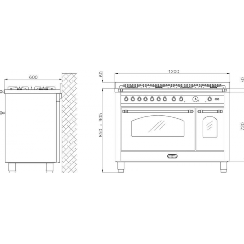 LOFRA PNMD126GV+E/2C Варочная панель: Автоматический электроподжиг Газ-контроль Чугунные решетки 7 газовых горелок: Передняя левая – 3,7 кВт (WOK) Задняя левая – 1,1 кВт Центральная задняя левая – 1,75 кВт Центральная передняя левая – 1,75 кВт Центральная Правая – 3,7 кВт (WOK) Передняя правая - 2,8 кВт Задняя правая – 1,1 кВт Основная духовка: Газ контроль в духовке Конвекция Электрический гриль Общий объем 101 л Телескопические направляющиее (2 уровня) 4 уровня приготовления 3 стекла дверцы Тангенциальная система охлаждения Электронный программатор: таймер, отсрочка включения, автоматическое выключение Акустический сигнал окончания приготовления Электронный контроль температуры (50 – 260 С) 2-я духовка: Электрическая статическая 3 функции приготовления – большой гриль Общий объем 35 л Максимальная температура 250 С 2 уровня приготовления 3 стекла дверцы Тангенциальная система охлаждения Аксессуары в комплекте: Чугунные решетки: 4 Чугунная решетка WOK: 1 Противень глубокий: 2 Решетка: 2 Бренд: LOFRA Модель: PNMD126GV+E/2C