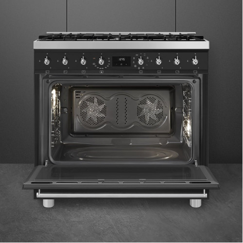 Smeg C9GMMB2 Рабочий стол: нержавеющая сталь Количество конфорок: 6 газовых Мощность 1-й зоны: 4.20 кВт Мощность 2-й зоны: 1.00 кВт Мощность 3-й зоны: 1.00 кВт Мощность 4-й зоны: 1.80 кВт Мощность 5-й зоны: 1.80 кВт Мощность 6-й зоны: 3.00 кВт Газ-контроль Электроподжиг Чугунные решетки Духовка: Тип: электрическая Объем: 115 л Паровая очистка Материал внутренней камеры: Эмаль Ever Clean Количество уровней приготовления: 5 Тип направляющих: Металлические направляющие Количество ламп подсветки: 2 Тип ламп подсветки: Галогенная Мощность ламп подсветки: 40 Вт Количество конвекторов: 2 Программатор длительности приготовления: Старт и стоп Открывание дверцы: Стандартное открывание Освещение при открытой дверце Съемная дверца Внутреннее стекло дверцы сплошное Внутренние стекла дверцы съемные Тип гриля: Электрический Мощность гриля: 1700 Вт Мощность большого гриля: 2900 Вт Мощность нижнего нагревательного элемента: 1700 Вт Мощность верхнего нагревательного элемента: 1200 Вт Мощность кольцевого нагревательного элемента: 2 x 1550 Вт Регулировка температуры: Электромеханический Режимы работы: Статический Вентилируемый Термовентилируемый Эко Гриль малый Гриль большой Гриль большой + конвекция Нижний нагрев Нижний нагрев + конвекция Размораживание Управление и индикация Дисплей: Сенсорное управление Цвет переключателей: Нержавеющая сталь матовая, обработка против отпечатков пальцев Поворотные переключатели: Classica Количество переключателей: 8 Таймер Акустический сигнал окончания приготовления Минимальная температура: 50 °C Максимальная температура: 260 °C Безопасность Количество стекол дверцы: 3 Количество теплоотражающих стекол дверцы: 2 Термостат безопасности Система охлаждения: Тангенциальная Аксессуары в комплекте Чугунное кольцо WOK: 1 Подставка для посуды MOKA: 1 Термощуп для мяса: 1 Решетка с задним и боковым упором: 1 Решетка для противня: 1 Противень (20 мм): 1 Противень глубокий (40 мм): 1 Жиклеры для других типов газа: G30 сжиженный газ Дополнительная информация: Габариты: 90x90x60 см Цвет: Нержавеющая сталь Цвет: Черный матовый Отделка: Черный матовый Эстетика: Classica Дизайн: Квадратный Серия: Sinfonia Материал: Нержавеющая сталь Дверца: С 2-мя горизонтальными полосами Обработка панели управления: Нержавеющая сталь с обработкой против отпечатков Цвет варочной панели: Нержавеющая сталь Ручка: Classica Защитный бортик Тип решеток: Чугунные Тип стекла: Eclipse Ручки: Сатинированная нерж. сталь Ножки: Серебристый Отсек для хранения: Откидная дверца Тип газовых горелок: Стандартный Крышки горелок: Эмал. матово-черные Класс энергоэффективности: A Номинальная мощность: 3200 Вт Напряжение: 220-240 В Частота тока: 50/60 Гц Длина электрического кабеля: 120 см Тип электрического кабеля: Да, однофазное Номинальная мощность газа: 12600 Вт Тип газа: G20/G25 20/25 мбар