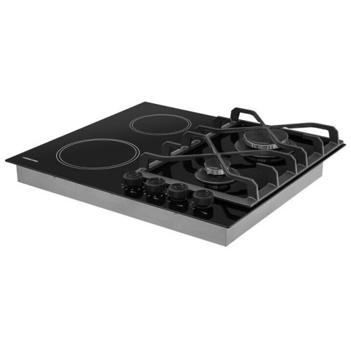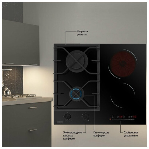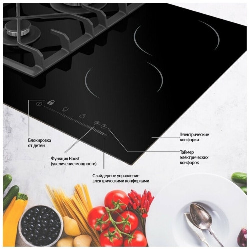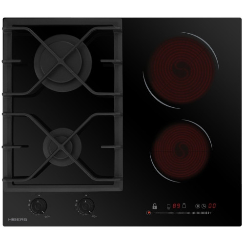 Встраиваемая варочная панель HIBERG VM 6021 B - комбинированного типа, новая технология предусматривает две газовые и две электрические конфорки. Поверхность выполнена из стеклокерамики, такое покрытие устойчиво к высоким температурам, удобно в очистке и очень прочное. Рабочая поверхность с двумя электрическими конфорками имеет мощность 3000 Вт, диаметр и мощность конфорок разный, поэтому есть возможность использовать разную по форме и объему посуду, а постепенное остывание электрической поверхности позволяет поддерживать температуру только приготовленного блюда. Управление электрическими конфорками сенсорное, по типу слайда можно регулировать мощность конфорок одним движением пальца. Электрические конфорки еще удобны тем, что если вы не можете долго стоять у плиты в ожидании, пока на медленном огне приготовится какое-то блюдо, достаточно выставить таймер, который автоматически отключит конфорку через заданное время: от 1 до 99 минут. А с функцией PowerBoost можно за короткое время увеличить подачу мощности на электрической конфорке, но не более, чем на 5 минут. Поверх газовых конфорок установлены мощные чугунные решетки, их поверхность гладкая и ровна, поэтому они очень удобные в использовании. Основное преимущество для газовых конфорок - функция «электроподжиг», с которой вы забудете про спички или зажигалку, достаточно просто нажать и повернуть регулятор – конфорка включится автоматически. За безопасность подачи газа отвечает система «Газ-контроль», которая обезопасит пользователя от вероятности воспламенения при утечке газа. Мощность газовых горелок регулируется металлическими повторными переключателями, цветом под темный металл. Особенности и преимущества: - газоэлектрический тип варочной поверхности; - сенсорный таймер (индивидуальный для каждой электрической конфорки); - функция PowerBoost; - сенсорное (слайдерное) управление для электрических конфорок; - электроподжиг; - газ-контроль; - чугунная решетка; - легкость в уходе. Выбирая технику HIBERG, вы можете быть уверены в премиум качестве и долговечности продукта!