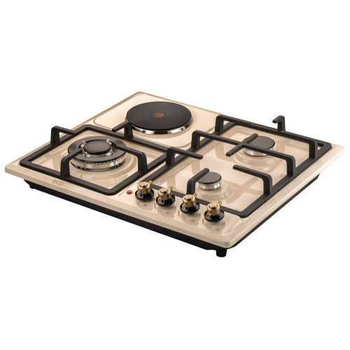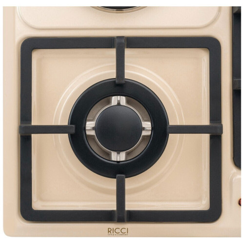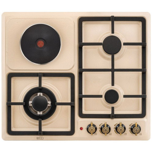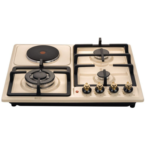 Встраиваемая комбинированная варочная панель Ricci HBS4538ER выполнена в приятном бежевом цвете имеет 4 конфорки, 3 газовых и одну электрическую. Одной из главных особенностей данной модели является трехкольцевая конфорка WOK мощность в 3.3 кВт, также нельзя не отметить функцию автоматического розжига, которая так популярна у всех современных варочных поверхностей. Конфорки: 1 x трехкольцевая конфорка WOK 3.3 кВт; 1 x электрическая конфорка 1.0 кВт; 1 x полу-быстрая конфорка 1.75 кВт; 1 X вспомогательная конфорка 1,0 кВт;