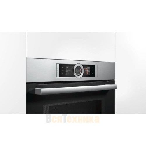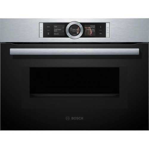 Компактный электрический духовой шкаф Bosch CMG676BS1 изготовлен из нержавеющей стали придает ему современный и стильный вид, который идеально впишется в любой интерьер кухни. Управление осуществляется с помощью сенсорных переключателей Control Ring, что делает использование духового шкафа удобным и простым. 2.5″ цветной TFT дисплей с сенсорными кнопками обеспечивает четкую и яркую визуализацию, а также предоставляет доступ к многофункциональным часам Easy Clock и таймеру.
