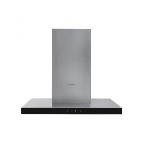 Черная каминная вытяжка со светодиодным экраном и таймером автоотключения.