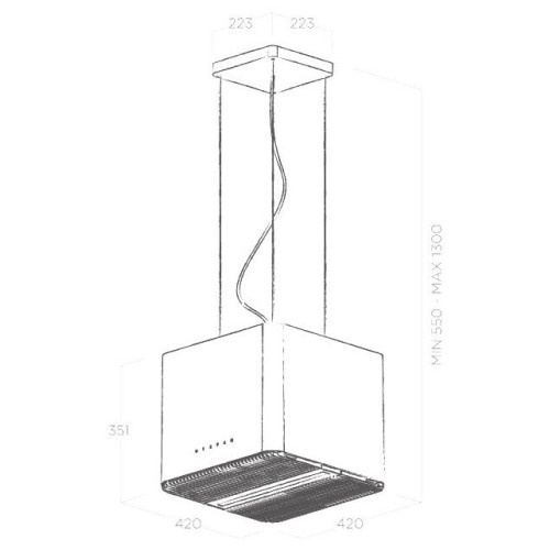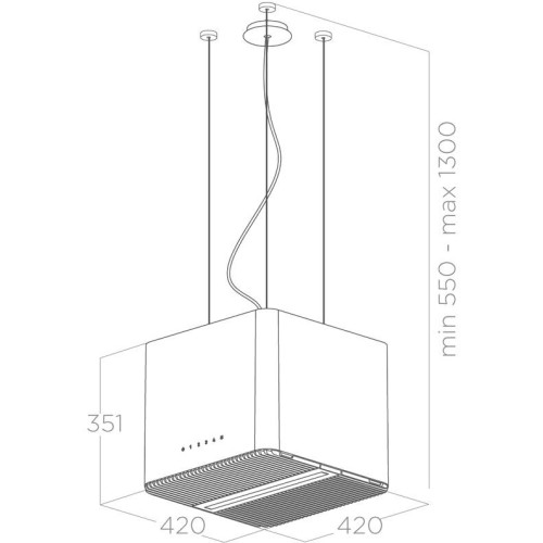 Тип и монтаж подвесная (потолочная) Оформление модерн (необычный дизайн) Технические параметры Принцип работы рециркуляция Потребляемая мощность 207 Вт Производительность (мотора / макс.) 610 м?/ч Максимальный уровень шума 60 дБ Количество скоростей 3 / + интенсивный режим / Количество двигателей 1 Фильтрация Жироулавливающий фильтр алюминиевый Возможность установки активного фильтра Функции и возможности Освещение светодиодные лампы / 1x7 Вт / Управление сенсорное Общее Высота (мин.) 55 см Высота (макс.) 130 см Ширина 42 см Глубина 42 см