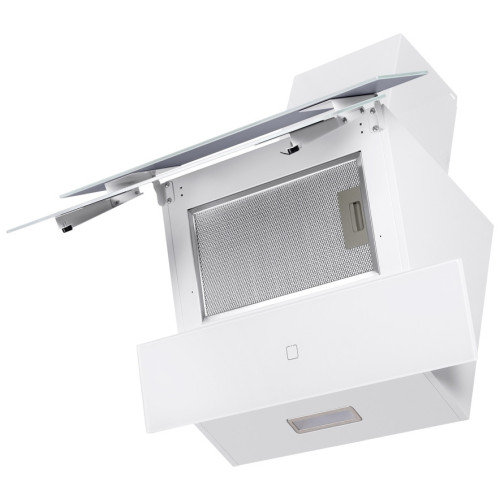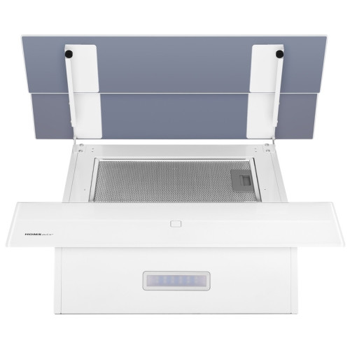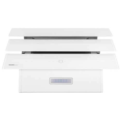 Вытяжка HOMSAir Vertical 60 Glass привлекает внимание нестандартной лицевой панелью. Стекла, за которыми находится жироуловитель, расположены каскадом. Если приобрести и установить угольный фильтр, то устройство сможет очищать воздух и возвращать обратно, а не только выводить.