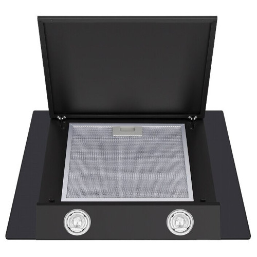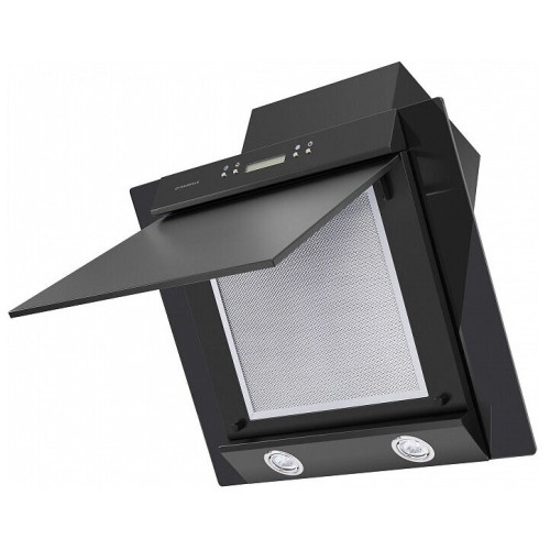 Стильная наклонная вытяжка шириной 60 см способна эффективно работать на кухне очень большой площади (до 40 кв.м). Используется в двух режимах: отвода (при подключении к системе вентиляции) и рециркуляции (при использовании сменного угольного фильтра). Корпус и фронтальная часть сделаны из нержавеющей стали с эмалированным покрытием черного цвета. Многослойный жироулавливающий алюминиевый фильтр, скрытый за откидной панелью, легко вынимается и полностью разбирается, что сильно упрощает его чистку. Рабочая зона увеличена за счет боковых панелей из закаленного стекла черного цвета . Э лектронное управление позволяет с помощью кнопок выбрать одну из 3-х скоростей вентилятора, установить 9-минутный таймер отключения и включить освещение, состоящее из 2-х LED-элементов по 1 Вт каждый. Все настройки отображаются на цифровом дисплее. М ощность мотора составляет 192 Вт, а максимальная производительность – 1050 м 3 /ч. Уровень шума при этом не больше 63 дБ.