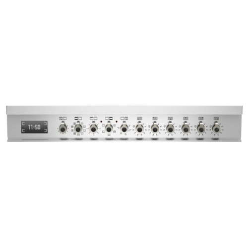 Впечатляющий дизайн сверх широкого варочного центра Bertazzoni преобразит кухню современного стиля, гармонично сочетая классические черты элементов отделки и современные передовые технологии. На варочной панели размещено пять индукционных зон приготовления. Большой многофункциональный электрический шкаф с цифровым программаторов и термощупом, имеет 11 функций: верхний нагрев, нижний нагрев, статический нагрев, обдув горячим воздухом, конвекционный нагрев, гриль, гриль с конвекцией, конвекция с нижним нагревом, быстрый преднагрев, размораживание, режим подсветки. Максимальная температура составляет 250 °С. Также духовка имеет один уровень телескопических направляющих, противень и 2 решетки для жарки, ручка для противня. Малый электрический шкаф, 6 функций: верхний нагрев, нижний нагрев, статический нагрев, гриль, гриль с вертелом, режим подсветки. Духовка имеет один уровень телескопических направляющих, 2 решётки, 1 противень. Третий электрический шкаф объёмом 24л для приготовления пиццы и фокачча.