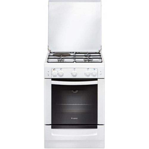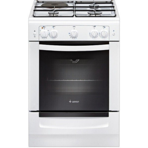 Плита с газовым жарочным шкафом и комбинированной варочной панелью, шириной 60 см. Фасад, рабочий стол и защитная крышка стола - эмалированные, горелки укрыты составными стальными решетками. Левая задняя конфорка - электрическая, мощностью в 1,5 кВт, мощность нагрева регулируется ступенчато (поворотная ручка). Все газовые горелки с электроподжигом (осуществляется нажатием кнопки на панели управления) и газ-контролем, оперативно перекрывающим подачу газа в случае затухания пламени. Духовка плиты с внутренним объемом в 55 л. оснащена термоуказателем, удобно регулировать температуру нагрева нижней горелки. Есть внутреннее освещение. Плита оснащена выдвижным ящиком для хранения посуды и противней, в комплектации предусмотрены регулировочные ножки.