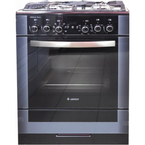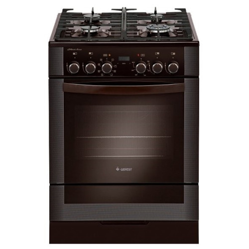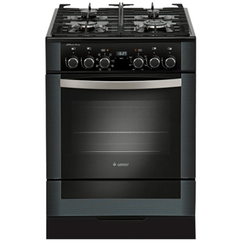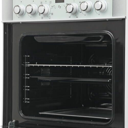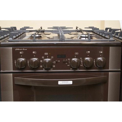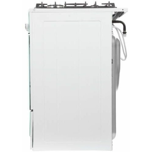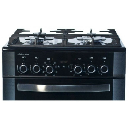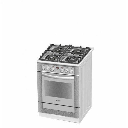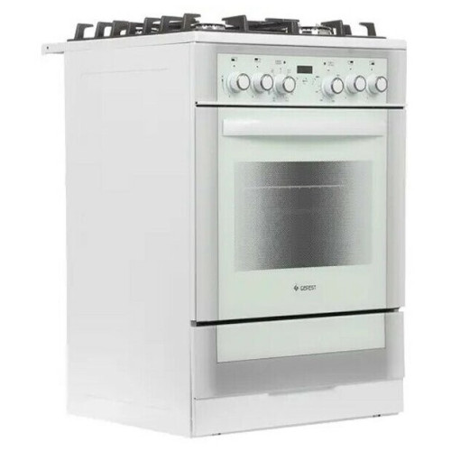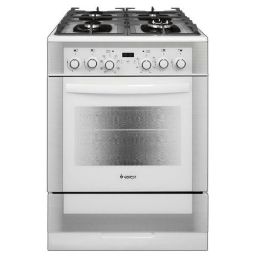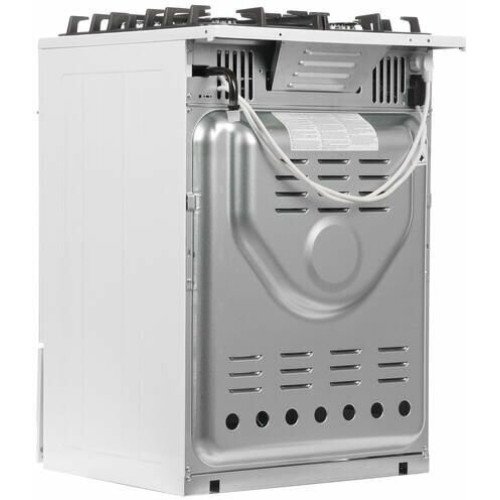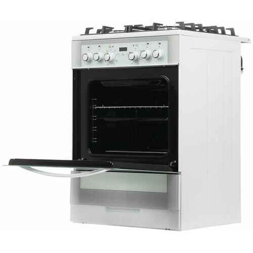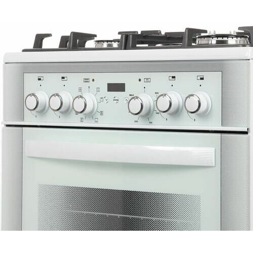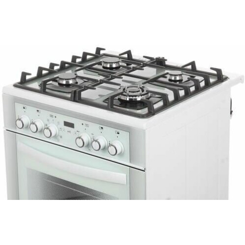 Белая плита шириной 60 см, с газовой варочной поверхностью и электрической духовкой. Привлекательный внешний вид и хорошая техническая оснащенность дополнены стеклянным покрытием фасада и рабочей поверхности. Поворотные ручки управления декорированы накладками, на панели расположен сенсорный таймер. Рабочий стол с 4 конфорками оснащен автоматическим электроподжигом и газ-контролем. Горелки защищены чугунными решетками. Комплектация рабочего стола дополнена горелкой с двумя контурами пламени, с быстрым и мощным нагревом. Духовой шкаф с внутренним объемом в 55 литров поддерживает несколько режимов работы: классический нагрев с терморегулятором, электрический гриль, ускоренный нагрев с конвекцией. Дополнена комплектация жарочного шкафа съемными вертелом и шашлычницей, а двухточечное внутреннее освещение упрощает контроль степени готовности продуктов.