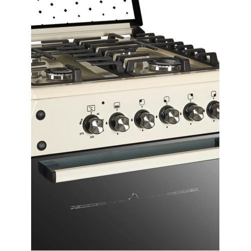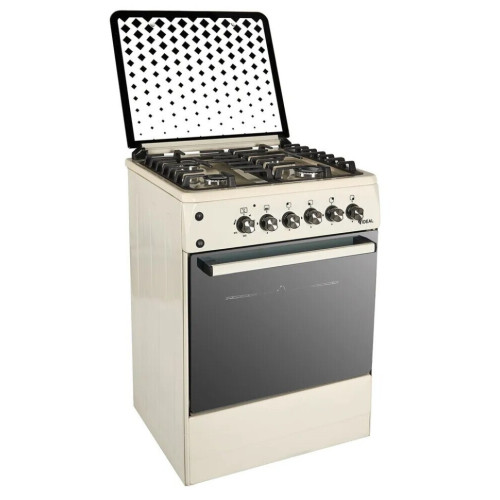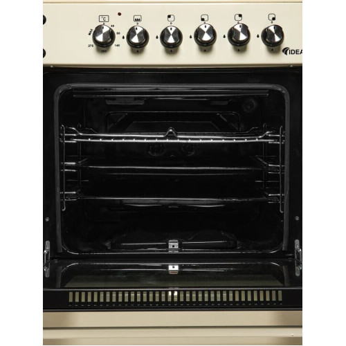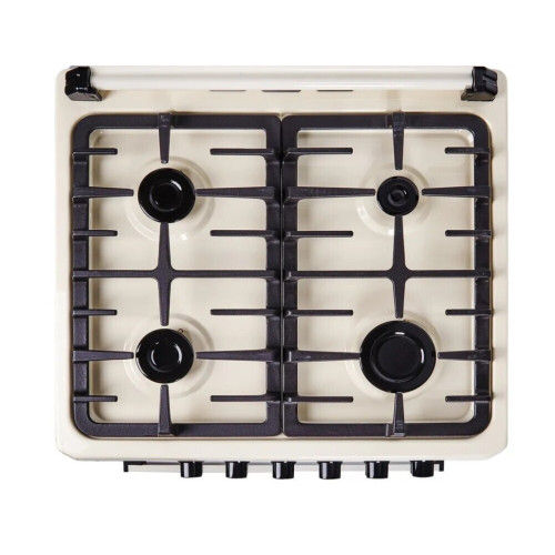 Плита оснащена четырьмя газовыми конфорками. Имеется удобный электроподжиг рабочего стола. Газ контроль остановит подачу газа, если пламя потухнет. Крепкие и надежные чугунные решетки выдержат даже очень тяжелую посуду. Стеклянная защитная крышка рабочего стола убережет от брызг и пыли. Вместительная духовка - верх ТЭН электро, низ - газ. В комплекте никелированная решетка, эмалированный квадратный противень 2 шт и вертел для гриля.