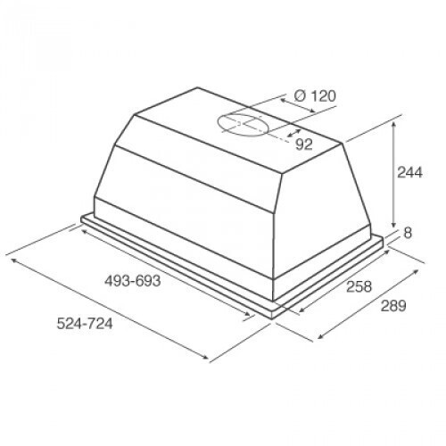 * полновстраиваемая кухонная вытяжка * встраивается в навесной шкафчик * отвод / циркуляция * Макс. производительность 990 куб. м/ч * ширина для установки 72 см * мощность 200 Вт * механическое управление