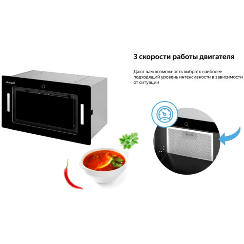Вытяжка Aura 850 BL полностью встраивается в шкаф над варочной панелью шириной 60 см и подходит для кухни площадью до 25 кв.м. Экран из черного закаленного стекла скрывает алюминиевые фильтры, которые надежно защищают мотор от жира и испарений. Периметральная система всасывания увеличивает эффективность всасывания запахов, при этом сохраняя низкий уровень шума. Выбрать одну из трех скоростей или включить таймер можно легким прикосновением пальца к сенсорной панели управления. Чувствительные сенсоры реагируют на прикосновение даже мокрых рук. Для дополнительного освещения в вытяжке установлены яркие светодиоды Double strip LED, которые отличаются низким потреблением энергии. Вытяжка WEISSGAUFF Aura 850 BL работает в режимах отвода и рециркуляции. При подключении в режиме отвода все запахи и испарения выводятся прямо в вентиляционное отверстие.