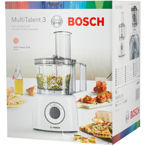 Кухонный комбайн Bosch MCM 3110 MultiTalent 3 - компактный и многофункциональный кухонный помощник при приготовлении еды и выпечки. Особенности: Практичный: насадки можно хранить внутри чаши, таким образом они всегда под рукой. Многофункциональность: терка, шинковка, помол, измельчаение и многое другое - благодаря таким насадкам как универсальный нож и цельнометаллические диски для шинковки крупными и мелкими ломтиками Компактная вертикальная конструкция прибора экономит место на кухонном рабочем столе Отличные результаты за короткое время: благодаря мощному мотору 800 Ватт, 2 скоростям и дополнительному импульсному режиму Легко мыть: многие насадки можно мыть в посудомоечной машине