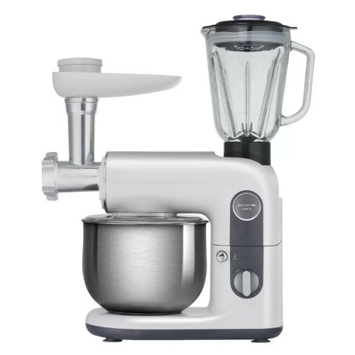 Кухонная машина Polaris PKM 1104 облегчает приготовление различных блюд. Модель можно использовать для смешивания, измельчения и взбивания. За счет встроенной мясорубки обеспечивается возможность получения фарша из мяса, рыбы. Для приготовления смузи и коктейлей есть блендер. Для замешивания теста нужно применять планетарный миксер. Модель оптимальна для использования в домашних условиях, а также на профессиональной кухне в ресторанах или кафе. Кухонная машина Polaris PKM 1104 имеет специальный регулятор для корректирования скорости вращения насадок для взбивания и смешивания продуктов, а также ножей в блендере. Вместительная чаша произведена из нержавеющей стали. Прочный материал не деформируется и не покрывается коррозией при взаимодействии с водой. Кувшин блендера изготовлен из прозрачного стекла. На стенках емкости есть деления для определения объема. Для защиты мотора от перегрева устройство оснащено встроенным предохранителем, который обеспечивает автоматическое отключение в процессе длительной работы. Кухонная машина Polaris PKM 1104 с прорезиненными ножками не скользит на столе или другой горизонтальной поверхности. Для удобной загрузки ингредиентов оптимально использовать откидной механизм основания. Нож и сетка для мясорубки произведены из нержавеющей стали, которая не окисляется при взаимодействии со внешней средой. Съемные детали нужно очищать с помощью проточной воды, губки или салфетки.