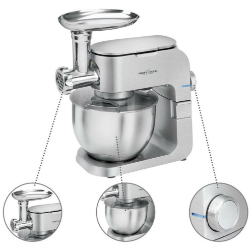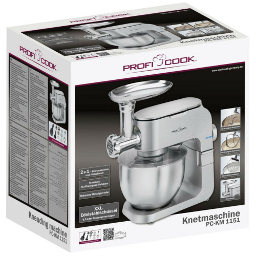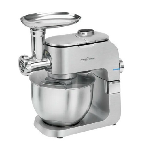 Мощный, надежный и многофункциональный кухонный комбайн от известного производителя техники для кухни — компании Profi Cook. Прежде всего эта модель может похвастаться высокой мощностью, поддержкой планетарной системы смешивания и многофункциональностью, что и позволило производителю позиционировать ее в верхний ценовой диапазон. Устройство оснащено крупной чашей для смешивания объемом 6,5 л — в такой емкости вы можете одновременно приготовить большое количество пищи. Прибор работает на мощности 1300 Вт, благодаря чему легко и просто справляется даже с наиболее твердыми или вязкими ингредиентами. Бесступенчатый регулятор скорости позволяет мягко переключаться между 6 предустановленными режимами, изменяя скорость вращения насадок в зависимости от типа обрабатываемых продуктов. Дополнительно кухонный комбайн Profi Cook PC-KM 1151 поддерживает импульсный режим, в котором насадки вращаются не постоянно, а с небольшими перерывами, что считается наиболее оптимальным при обработке самых твердых продуктов. Система планетарного смешивания позволяет повысить эффективность работы устройства за счет того, что рабочий инструмент вращается не только вокруг своей оси, но и вокруг центра чаши. Комплектация прибора включает три насадки: венчик для взбивания, крюк для замеса густого теста и насадка для смешивания. Отдельного внимания заслуживает возможность использования устройства в качестве полноценной мясорубки — для приготовления мясного фарша, перетирания фруктов и овощей.