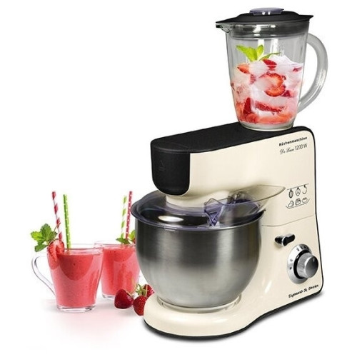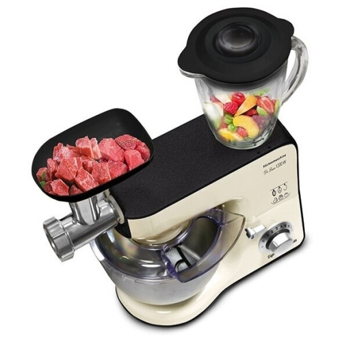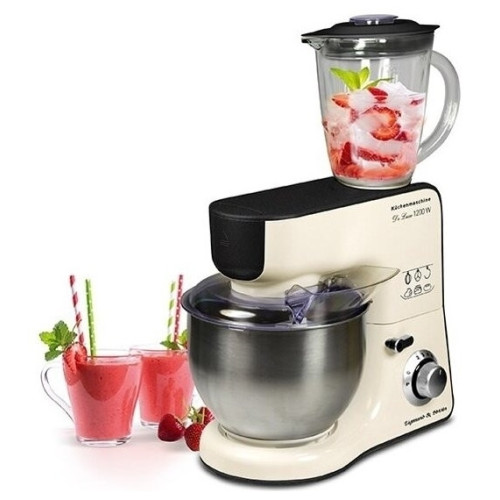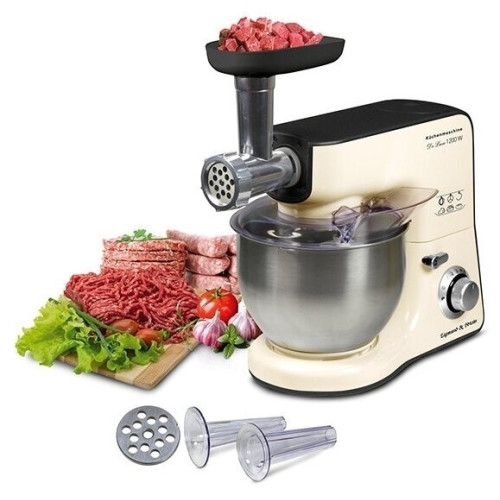 Основные характеристики Тип: кухонная машина Мощность: 1200 Вт Чаша: есть Управление Управление: механическое, поворотное Количество скоростей: 10 Плавная регулировка скорости: да Скорость вращения: 250 об/мин Количество режимов работы: 3 Насадки Количество насадок: 5 Насадки: тестомес, для смешивания, для взбивания, мясорубка, блендер Емкость блендера: 1.5 л Насадки для мясорубки: решетка, насадка для сосисок, насадка для кеббе Чаша Объем чаши: 5 л Материал чаши: нержавеющая сталь Безопасность Отключение при перегреве: да Отключение при поднятии блока: да Дополнительные характеристики Дополнительные режимы: импульсный Планетарное движение насадок: да Корпус и материалы Цвет: бежевый Материал корпуса: пластик Материал блендера: стекло Прорезиненные ножки: да Питание Длина сетевого шнура: 1.2 м Комплектация Венчик: в комплекте Насадка для перемешивания: в комплекте Крюк для теста: в комплекте Кожух для защиты от брызг: в комплекте Инструкция: да Размеры и вес Высота: 35 см Ширина: 20 см Глубина: 37 см Вес: 8.9 кг