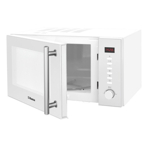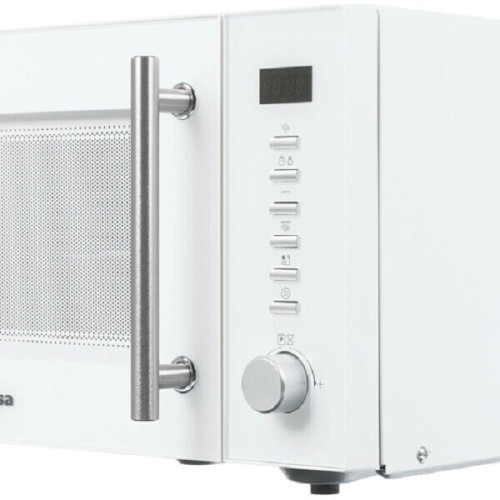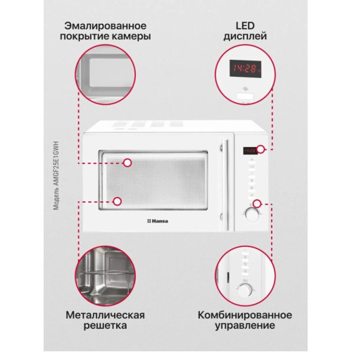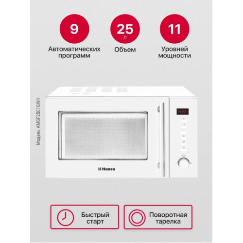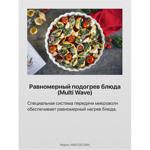 Белая микроволновая печь AMGF25E1GWH оснащена мощным грилем для создания хрустящей корочки, камерой из нержавеющей стали для простоты ухода, электронным программатором с дисплеем для комфортного управления мощностью разогрева, размораживания и автоматическими программами.
