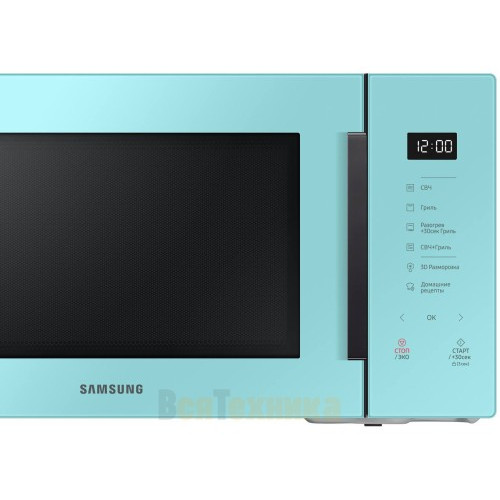 Продуманность модели Samsung MW5000T проявляется в каждой мелочи. Вращающаяся стеклянная тарелка большого диаметра обеспечивает равномерный прогрев. Внутреннее покрытие камеры Bio-enamel (биоэмаль) устойчиво к царапинам и запахам, а его гладкая поверхность упрощает уход. Дверца открывается нажатием на кнопку, что очень удобно, если руки заняты. Цифровой дисплей с подсветкой отлично читается при любом освещении.