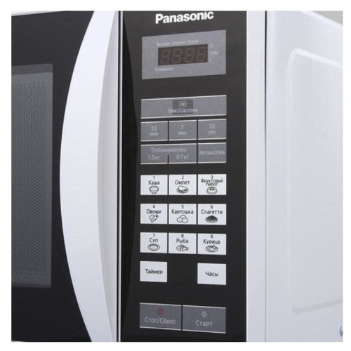 Микроволновая печь PANASONIC NN-ST342 – это отличный выбор для кухни, которой пользуется семья из нескольких человек. Позволяет готовить блюда значительного объема, разогревать или размораживать продукты. Внутренний поворотный стол имеет диаметр 28,5 см, а значит, вы можете использовать тарелки удобного размера. Микроволновка радует стильным дизайном, поэтому ее можно устанавливать как в закрытые, так и в открытые ниши в кухонной мебели. Обзор технических характеристик модели PANASONIC NN-ST342, а также отзывы покупателей, дают возможность объективно выделить следующие эксплуатационные преимущества: • Внутреннее керамическое покрытие печи – это простота очистки камеры. Жирные, пригоревшие и другие сложные загрязнения убираются без малейшего труда. • Опция блокировки от детей, позволит вам устанавливать агрегат даже на небольшой высоте, будучи уверенным, что малыши не смогут запустить микроволновку. • Мощность в 800 Вт делает возможным режим ускоренной разморозки, который позволит в течение 2-3 минут подготовить к кулинарной обработке даже продукты «глубокой заморозки». • Многофункциональность микроволновой печи NN-ST342 – гарантия того, что даже самые сложные рецепты будут удаваться вам «на отлично».