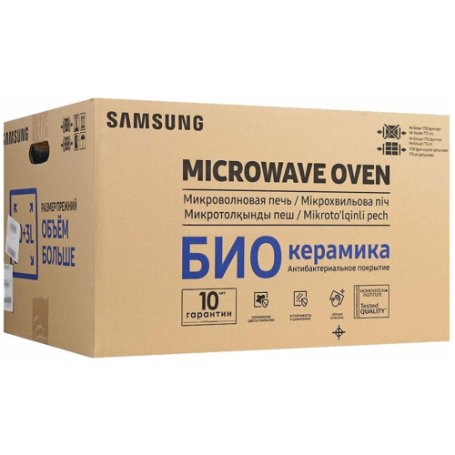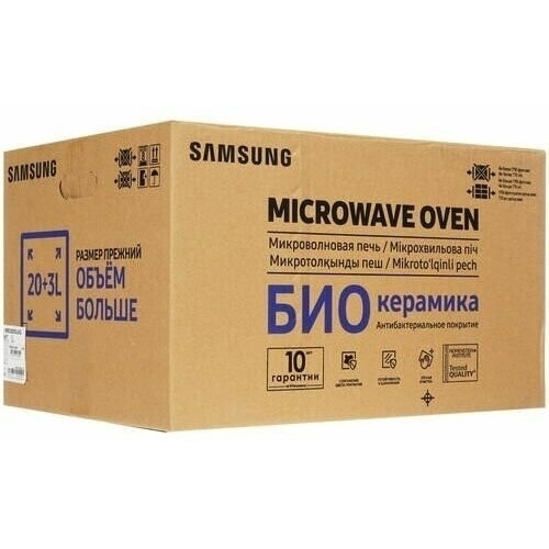 Микроволновая печь Samsung ME88SU - это 23 литра полезного объема и 800 ватт полезной мощности СВЧ-излучателя. Объединенные с системой тройного распространения микроволн, они обеспечивают равномерность прогрева, ускоренное размораживание и качественное приготовление любой пищи. Внутреннее керамическое покрытие отличается высокой прочностью, что позволяет ему сохранять свои качества в течение длительного срока. Керамическая эмаль не впитывает запахи, препятствует распространению бактерий, всегда легко очищается от жира и других загрязнений. Продуманная панель управления со светодиодным дисплеем, множество автоматических режимов приготовления, функция блокировки панели управления от детей и Eco режим, позволяющий сэкономить до 40% электроэнергии в режиме ожидания, обеспечивают высокую эффективность, безопасность и удобство использования микроволновой печи Samsung ME88SU.