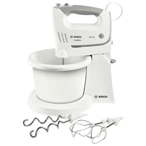 Миксер Bosch MFQ 36460 стационарного типа выполнен из высококачественного пластика белого цвета. Модель оснащена вращающейся чашей, что гарантирует высокое качество смешивания ингредиентов. Объем чаши составляет три литра. За съемными частями миксера легко ухаживать, поместив их в посудомоечную машину. Мощность миксера Bosch MFQ 36460 составляет 450 Вт, мотор работает тихо и бесшумно. С помощью пяти режимов скорости можно выбрать оптимальный для каждого отдельного блюда. Скорости переключаются механически с помощью кнопки управления. В комплект входит насадка-венчик для блюд легкой и средней текстуры. Спиралевидная насадка-крюк предназначена для приготовления густого теста на пельмени. Насадки удобно снимаются с помощью специальной кнопки на ручке прибора. Функции миксера дополнены турборежимом с усиленной кратковременной скоростью. Импульсный режим предназначен для более тщательного измельчения продуктов.